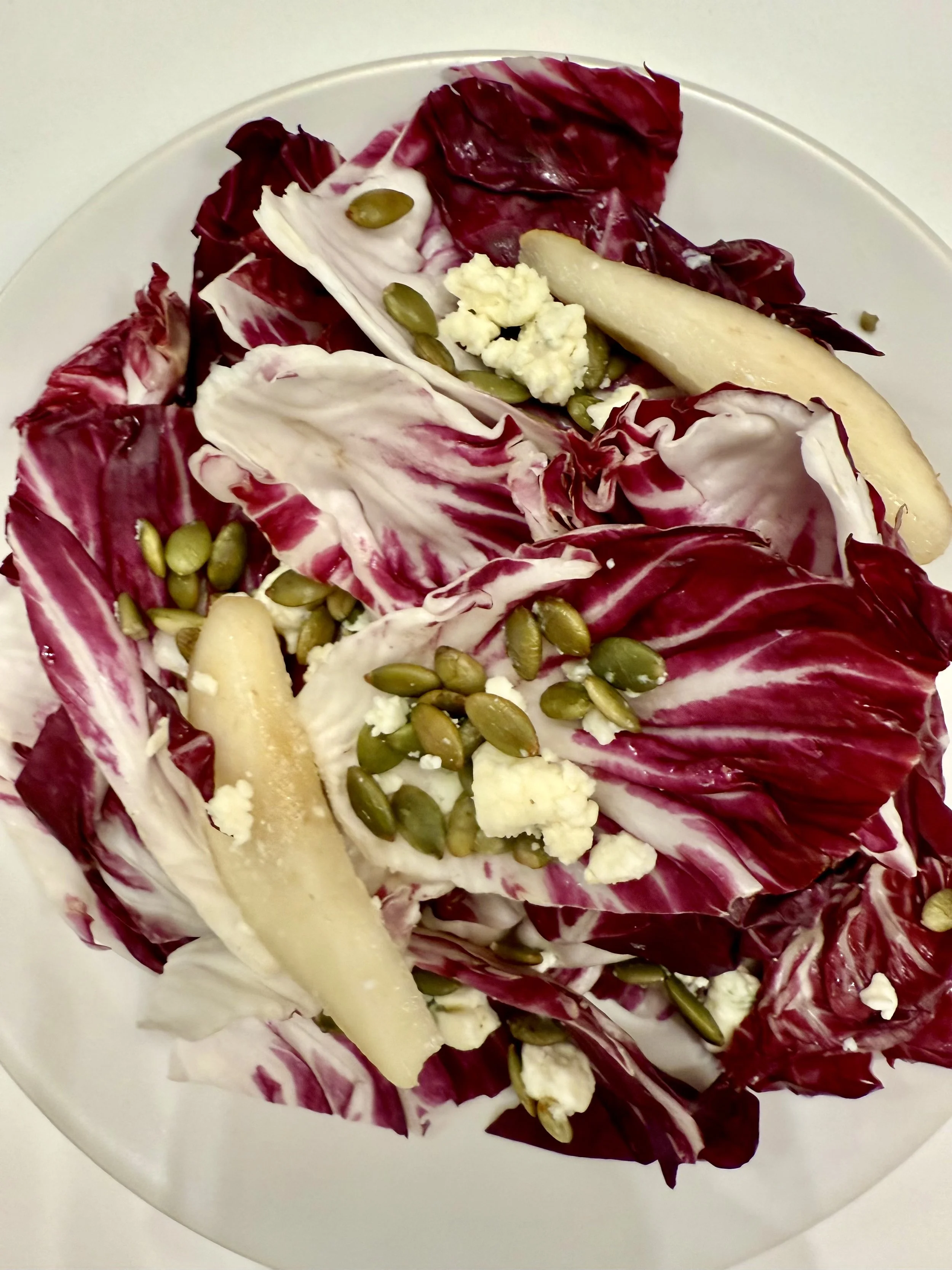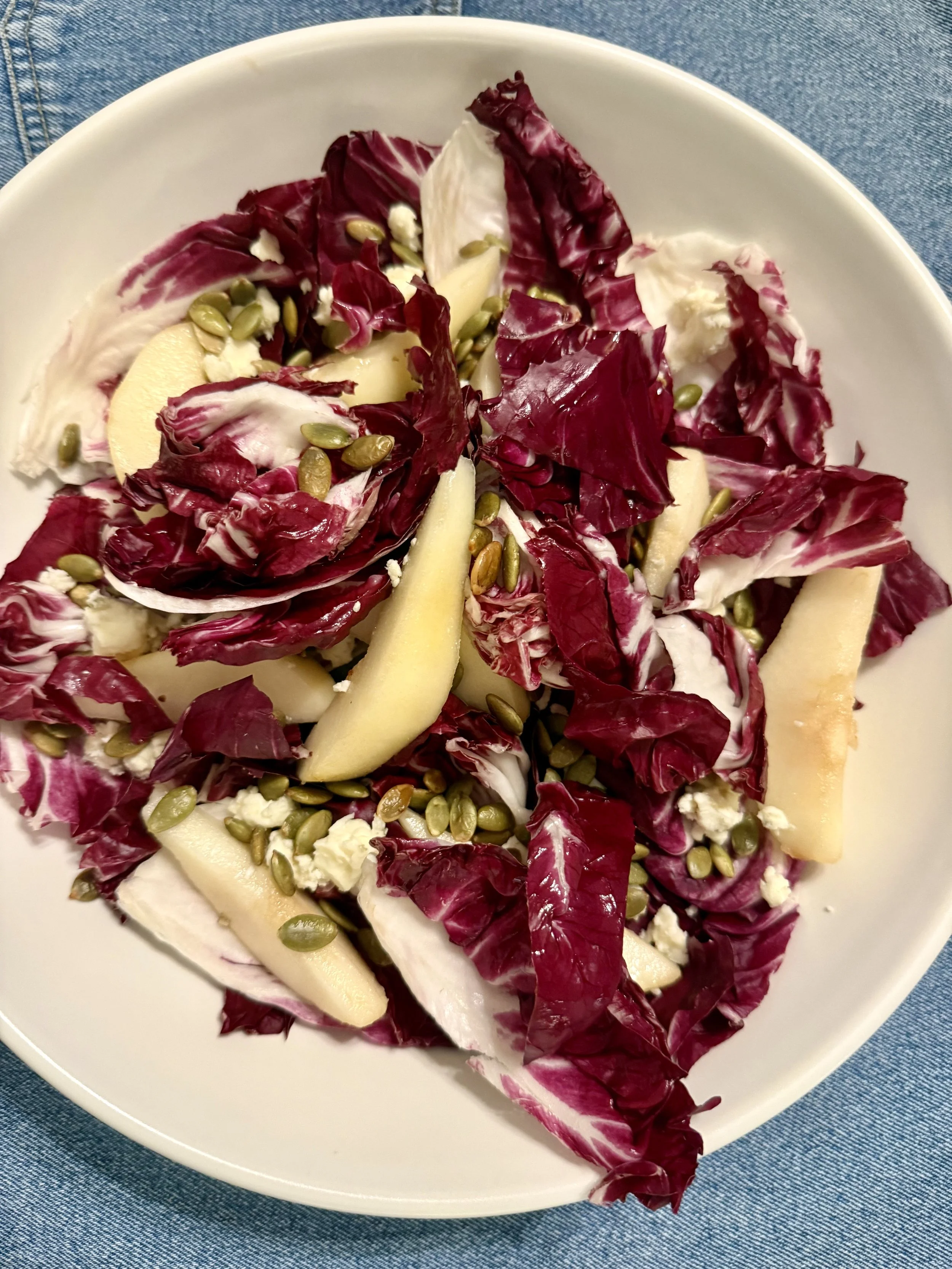 I should have left the skin on the pear to get the green color against the purple. The maple vinaigrette with the toasty, salty pepitas is lip-smacking good.