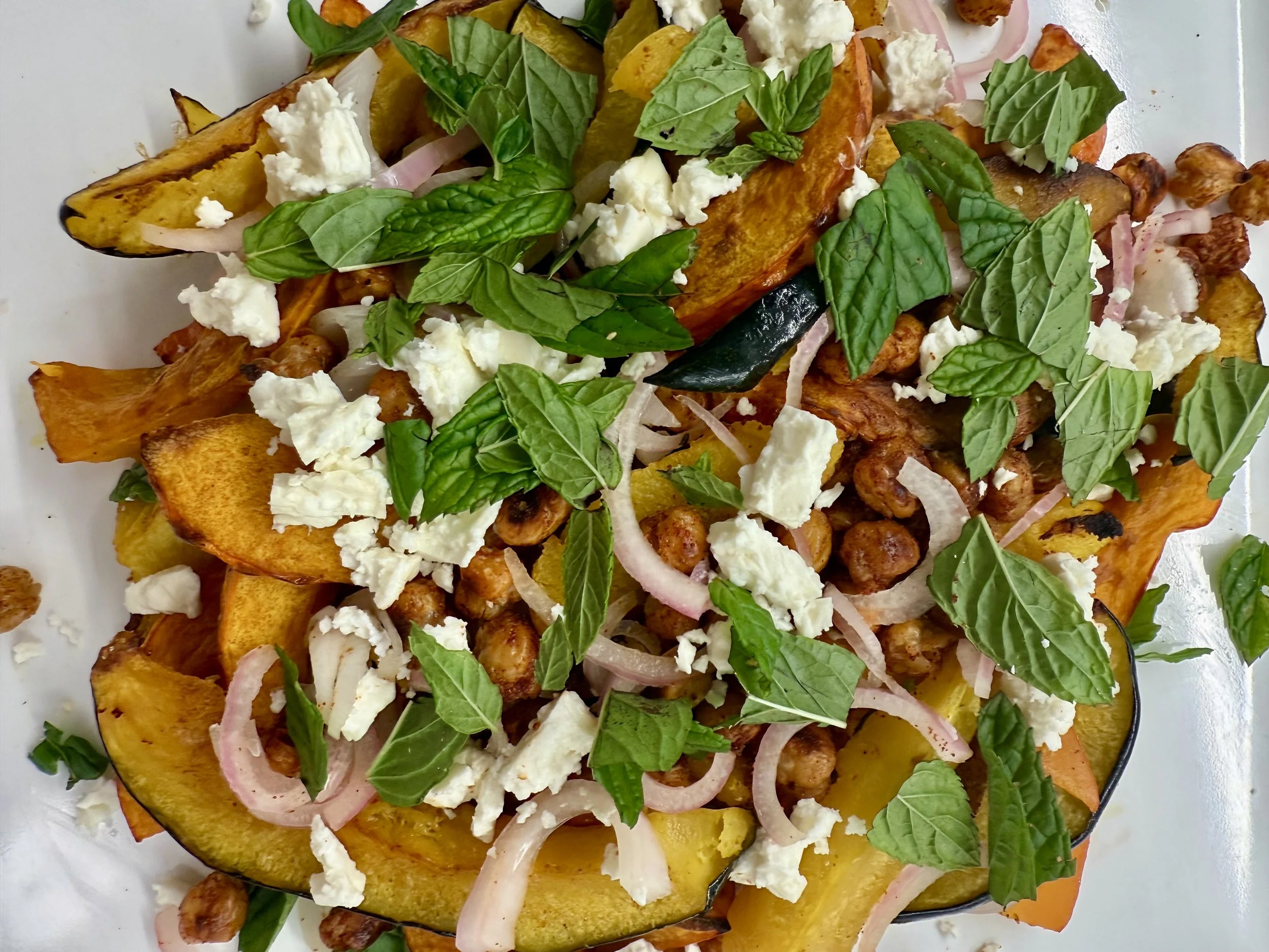 To get the full visual impact of this Roasted Squash, Crispy Chickpea and Feta dish, try to use rings of delicate squash to add another shape to the dish. Alas, my store was out of delicata.