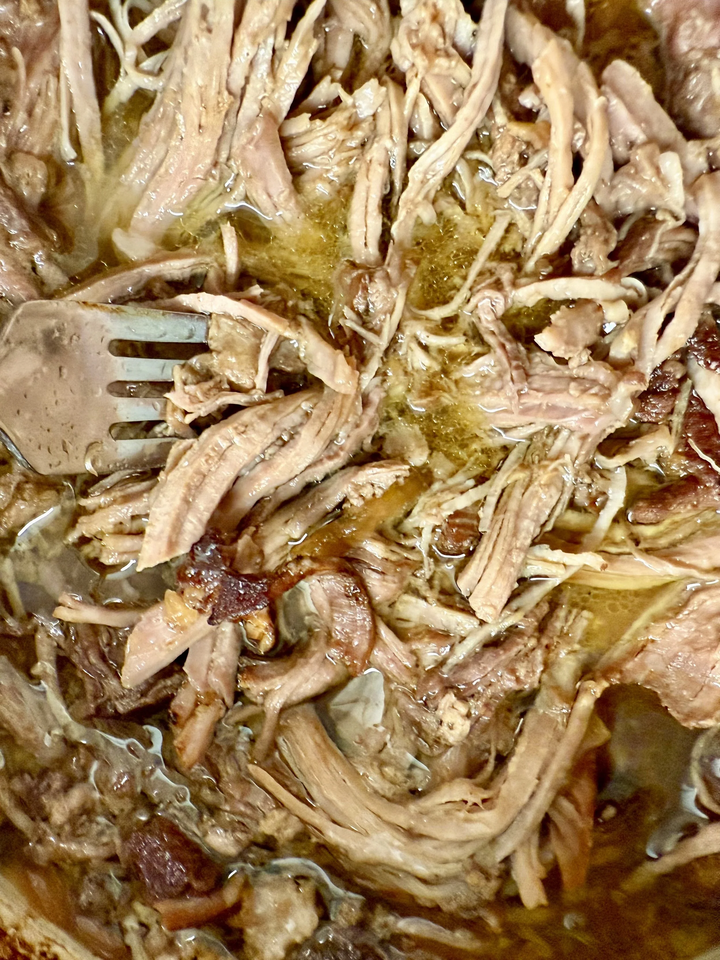 Bring to simmer, cover pot. Put in oven and bake 2-3 hours flipping halfway through. I left it in the oven the full 3 hours to make sure the pork was really falling apart and could be shredded simply with a fork.