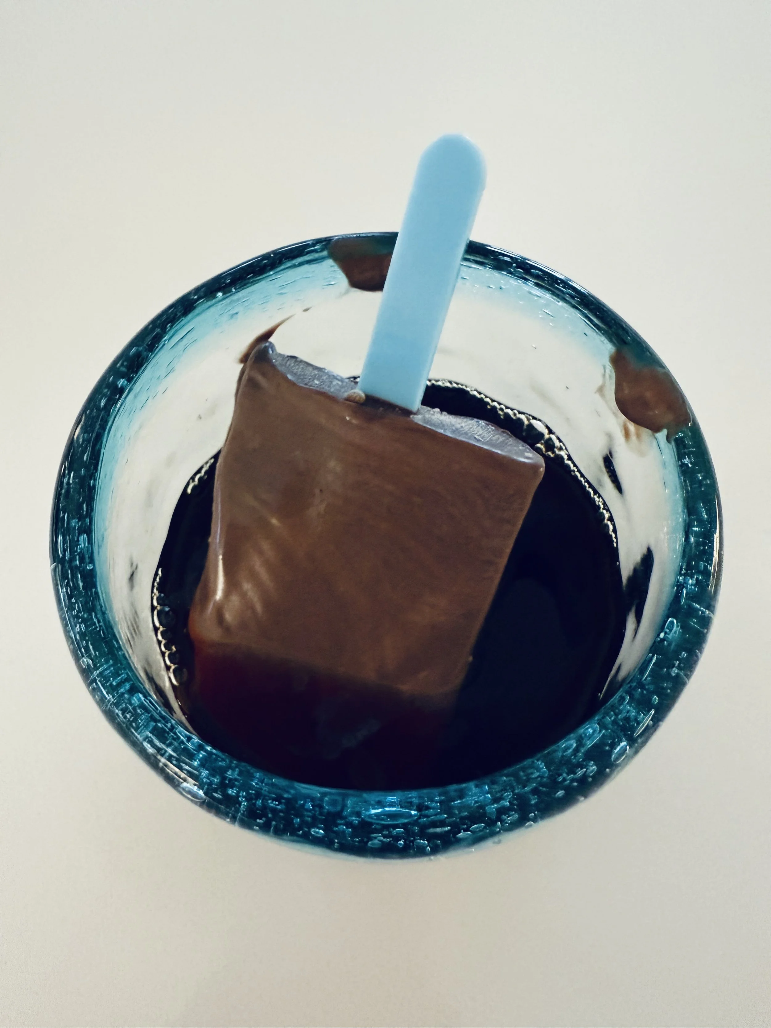Fudgesicle Affogato served in my aqua-rimmed recycled glassware. The coffee was chilled decaf. A shot of Kailua could be good also..